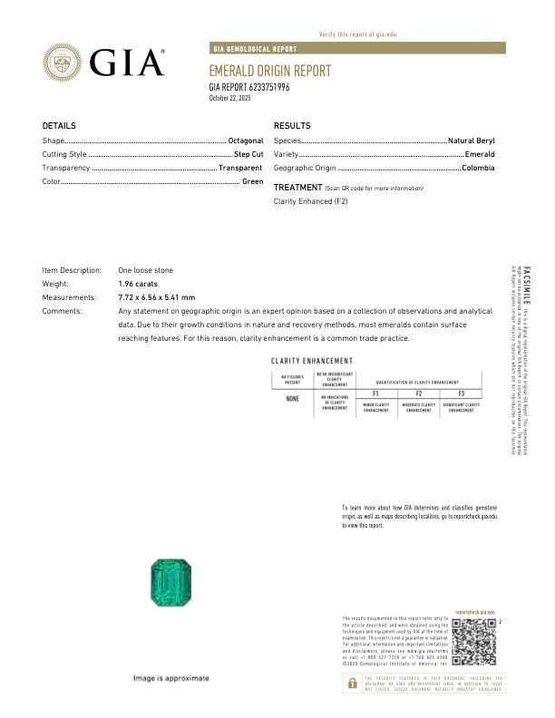 A stunning 1.96 carat Colombian emerald, authenticated by GIA certification. This exceptional gemstone showcases the rich, verdant hues that make Colombian emeralds highly coveted among collectors and jewelry enthusiasts. With its substantial carat weight and prestigious certification, this emerald represents a remarkable investment piece, perfect for creating a distinctive engagement ring, pendant, or statement jewelry. The natural beauty and rarity of Colombian emeralds make this gemstone a timeless treasure.