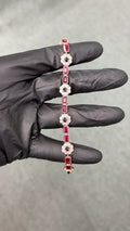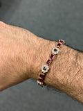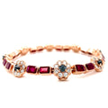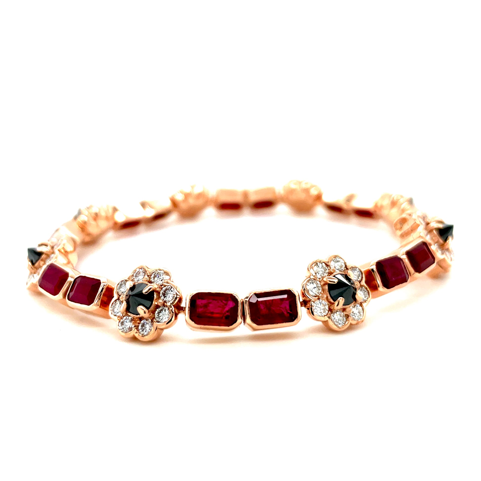 This bracelet showcases 8.28 carats of high quality natural emerald cut rubies (H), 2.87 carat of natural diamonds, and 2.39 carat of natural black diamonds that are uniquely set upside down. The diamonds boast a color of G and VS in clarity. An eye-catching blend of gems set in an heavy 10k rose gold setting. This piece weighs 40.74 grams and is 8" long.