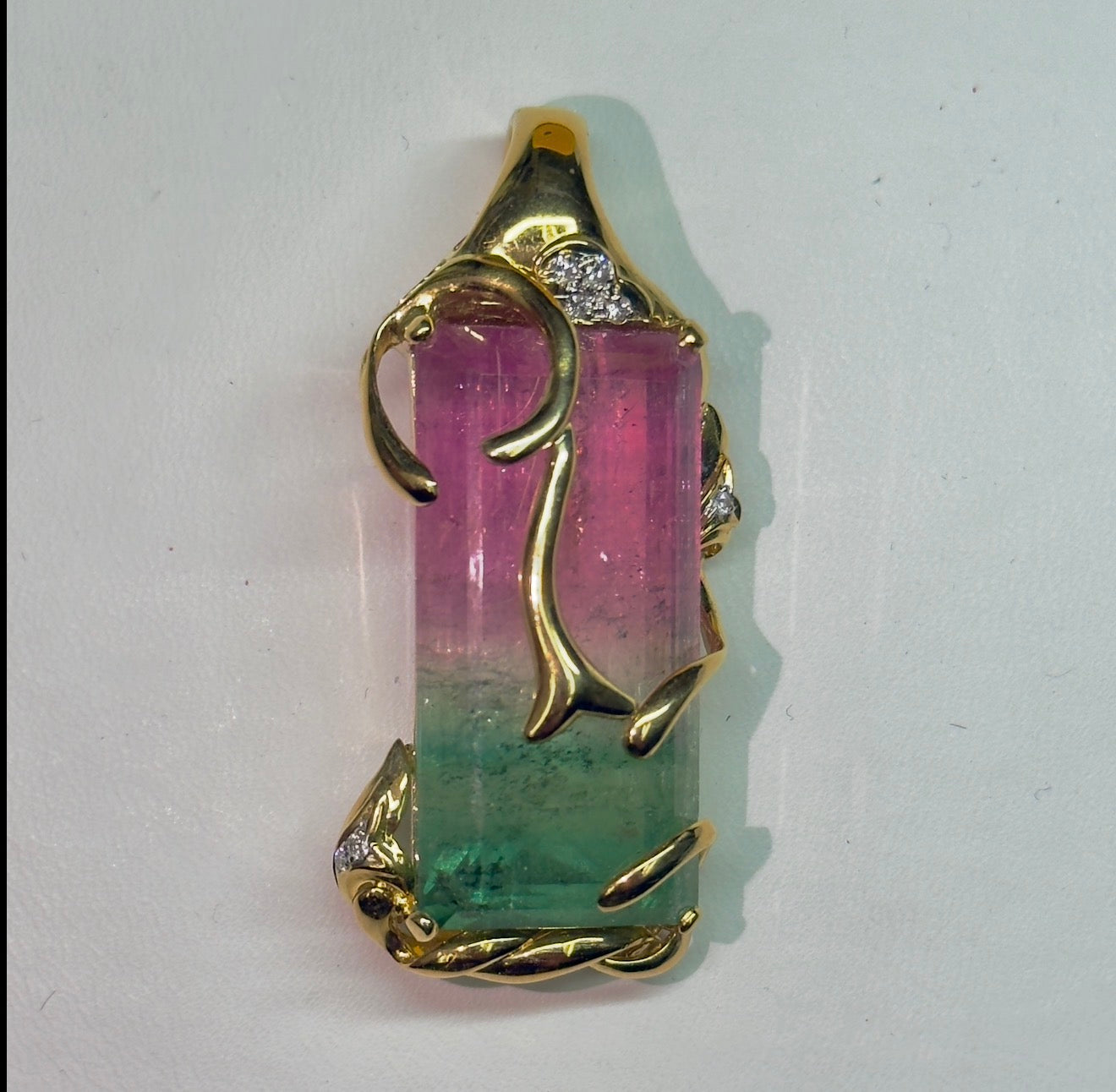 69.45 Carat Watermelon Tourmaline in 18K and 0.1 Carat Diamond Pendant - Closeout